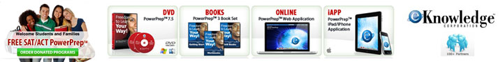 Parents Countdown to College Coach and eKnowledge are proud to announce the donation of SAT & ACT Test Prep programs for college bound teens and families. Over the past seven years, eKnowledge has donated more than $40 million of SAT and ACT PowerPrep™ Programs (at no profit to the company). This valuable donation from eKnowledge is supported by professional athletes from the NFL and MLB, and endorsed by over 100 national partners including corporations, non-profit organizations, groups and foundations such as Boy Scouts of America, Big Brothers Big Sisters, American Red Cross, The National Federation of High Schools (NFHS), Boys and Girls Clubs of America, all branches of the US Military and the Department of Defense.